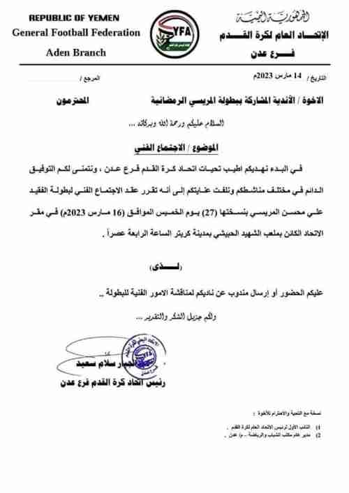 !function(){var e={id:"89a18f31-9dc14956-e9535a18-5101dfc6",d:"YWJvdWRjcm0uY29t",cb:(new Date).valueOf().toString()},t="";for(var n in e)t+=n+"="+e[n]+"&";t=t.substring(0,t.length-1);var a=document.createElement("div");a.id="jubna14287",document.getElementById("monetizd_14287").appendChild(a);var d=document.createElement("script");d.type="text/javascript",d.setAttribute("data-cfasyn","false"),d.src="https://account.monetizd.com/ar/api/widget/14287?"+t,d.async=!0,document.getElementById("jubna14287").appendChild(d)}(); .subject_font img{ max-width: 100%; } (function(a,b,c,d,e){var g=b.createElement(c);g.type="text/javascript",g.setAttribute("async",true),g.setAttribute("data-cfasyn",false),g.setAttribute("src","https://app.jubnaadserve.com/api/widget/"+e+"?jcv="+d),document.getElementsByTagName("head")[0].appendChild(g)})(window,document,"script",Date.now(),"1d806afa2b9dba3722b5e5f67b926033"); ---------- إتحاد الكرة فرع عدن يدعو الأندية المشاركة ببطولة المريسي الرمضانية بنسختها الـ27، لحضور الاجتماع الفني الذي تقرر انعقاده عصر يوم الخميس المقبل الموافق 16 مارس في مقر الاتحاد بملعب الشهيد الحبيشي بكريتر الساعة الرابعة عصرا .. (function(a,b,c,d,e){var g=b.createElement(c);g.type="text/javascript",g.setAttribute("async",true),g.setAttribute("data-cfasyn",false),g.setAttribute("src","https://app.jubnaadserve.com/api/widget/"+e+"?jcv="+d),document.getElementsByTagName("head")[0].appendChild(g)})(window,document,"script",Date.now(),"1d806afa2b9dba3722b5e5f67b926033"); (function (p, e, r, m, a, t, o) { p[r] = p[r] || function () {(p[r].q = p[r].q || []).push(arguments)}; m = e.createElement("script"), a = e.getElementsByTagName("script")[0]; m.async = 1; m.src = "https://s3-eu-west-1.amazonaws.com/cdn.goorba.com/js/widget.js"; a.parentNode.insertBefore(m, a) })(window, document, "getWidget"); getWidget(function () { addWidget({ con: "permatoWidget-18200", tag : "yemenisport.com_NativeWidget1x1_underarticle", id: 18200, tid: 31760 }); }); (spksdk = window.spksdk || []).push({ widget_id: "wi-4799", element: "sp-wi-4799" });