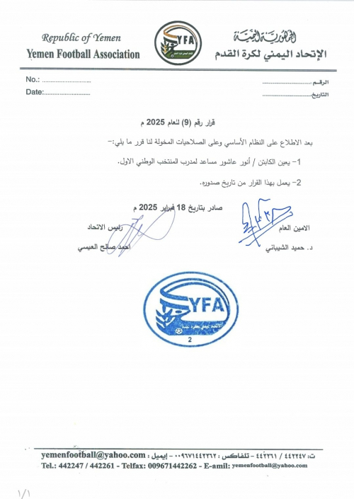 أصدر الاتحاد العام لكرة القدم القرار رقم ( 9 ) لسنة 2025 ، قضى بتعيين الكابتن أنور عاشور مساعداً لمدرب المنتخب الوطني الأول .