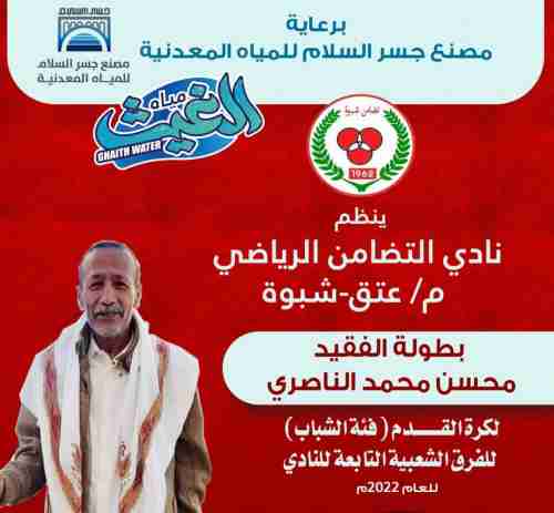 برعاية مصنع مياه جسر السلام للمياه المعدنية (مياه الغيث) وبتنظيم نادي التضامن الرياضي شبوة تنطلق يوم الجمعة القادم 2/12/2022 بطولة الفقيد محسن محمد الناصري لكرة القدم (فئة الشباب)، للفرق الشعبية التابعة للنادي، وذلك على ملعب اكاديمية ذيبان اسباير.