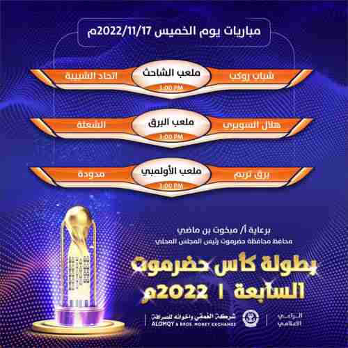 تشهد بطولة كأس حضرموت السابعة لكرة القدم الجارية منافساتها حالياً على ملاعب المحافظة (بارادم بالمكلا – الأولمبي بسيئون – الشاحث بالشحر – البرق بتريم ) برعاية محافظ حضرموت الاستاذ مبخوت مبارك بن ماضي وبمشاركة الراعي الإعلامي للبطولة شركة العمقي وإخوانه للصرافة وتنظمها اللجنة الرئيسية … تشهد يوم غد الخميس 17نوفمبر ثلاث مواجهات في الشحر وسيئون وتريم ضمن منافسات المرحلة التمهيدية (دور المجموعات ) المؤهل للدور الثاني (دور 16).