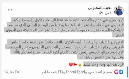 كرياضيين في عدن والله فرحنا عندما شاهدنا المنتخب الاول يقيم معسكره التدريبي في العاصمة عدن.. لاننا هرمنا وتعبنا من الوضع الحالي الذي تمر به لعبة كرة القدم بعدن .. خصوصا بعد حرمان أندية عدن من المشاركة في الدوري العام..