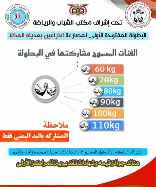 تنطلق بعد غدٍ الخميس، أولى بطولات وأنشطة اتحاد القوة ومصارعة الذراعين (الرست) بساحل حضرموت، والتي ستقام برعاية وزير الشباب والرياضة نايف صالح البكري ومحافظ حضرموت مبخوت مبارك بن ماضي، وإشراف مكتب الشباب والرياضة بساحل حضرموت وتحتضنها قاعة الأديب علي أحمد باكثير بجامعة حضرموت، في إطار الشراكة والتعاون بين المكتب والجامعة.
