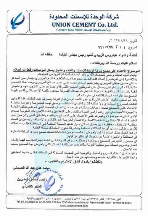 بعث المدير التنفيذي لمصنع شركة الوحدة للأسمنت، مذكرة عاجلة، إلى نائب مجلس القيادة الرئاسي، عيدروس الزبيدي، ناشد فيها استمرار الاعتداءات المتكررة على المصنع.