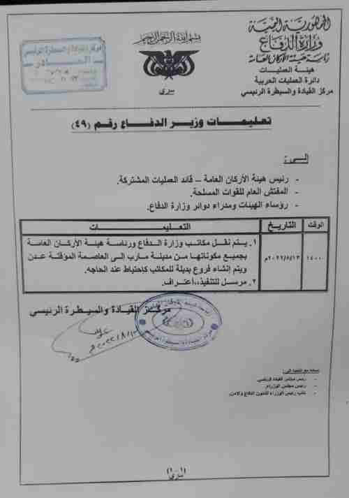 وكشفت وثيقة صادرة عن مركز القيادة والسيطرة الرئيسي في مدينة عدن إلى رئيس هيئة الأركان العامة في مأرب بنقل مقر ومكاتب وزارة الدفاع من مأرب إلى العاصمة المؤقتة عدن