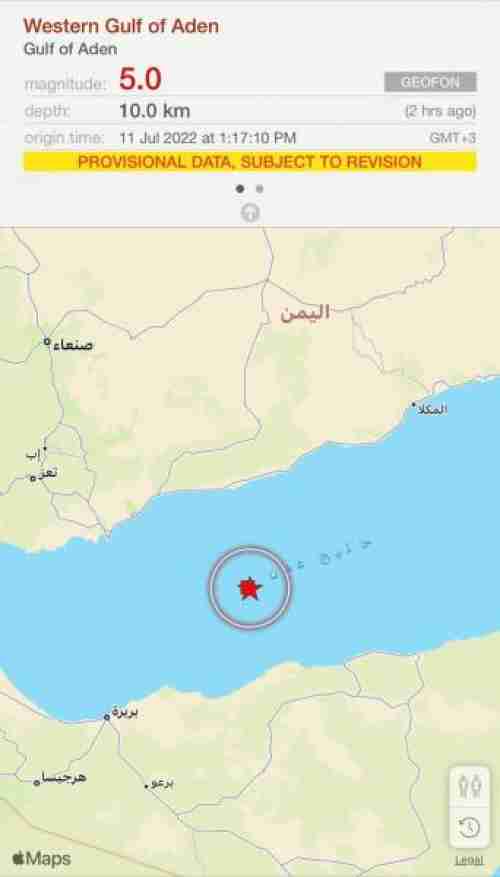 وبحسب المركز فان زلزال بقوة 5 درجان بمقياس ريختر ضرب خليج عدن وبعمق ١٠ كيلومتر.