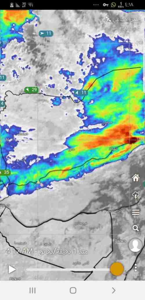 وقال الراصد رامي عبدالملك لكريتر سكاي:مستجدات حالة الطقس فجر اليوم الاثنين فوق اجواء السواحل الجنوبية توجد كتافه سحابيه لكن متلاشيه ولايوجد حمل حراري ونشؤء ركامي جديد.
