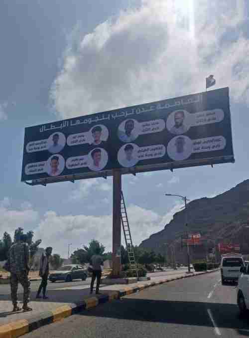 رفعت في العاصمة عدن اليوم لوحة ضخمة على مدخل المدينة لصور لاعبي منتخبنا الوطني وذلك ترحيباً بهم.