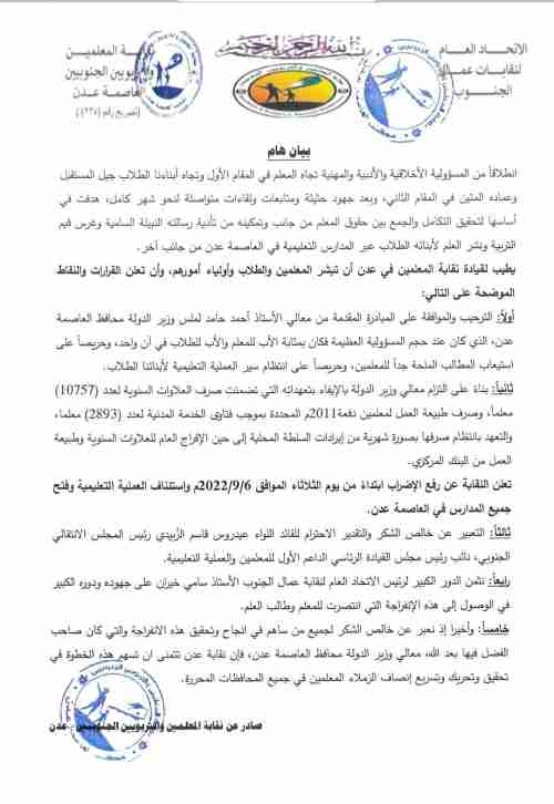 وأعلنت النقابة في بيانها عن ” رفع الاضراب ابتداء من يوم الثلاثاء 6 / 9 / 2022م واستئناف العملية التعليمية وفتح جميع المدارس في العاصمة المؤقتة عدن”.