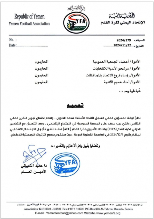 أصدرت الأمانة العامة للاتحاد اليمني لكرة القدم تعميماً برقم (379) لسنة 2024م بخصوص تعديل موعد الاجتماع الانتخابي للاتحاد اليمني لكرة القدم الذي كان من المقرر انعقاده بتاريخ 30 نوفمبر 2024م إلى التاسع من ديسمبر 2024م.